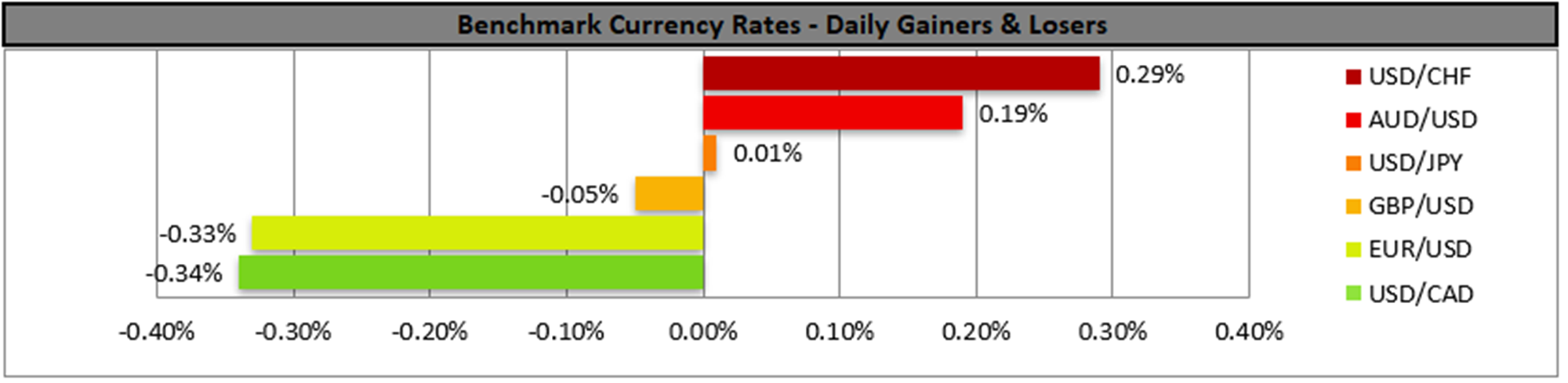USD/JPY remained in a tight sideways motion yesterday. We tend to maintain our bias for the sideways motion between the 146.30 (S1) support line and the 148.25 (R1) resistance line to continue for now. We note that the RSI indicator continues to run along the reading of 50, implying a rather indecisive market which may allow the sideways motion to continue. Should the bulls take over, we may see the pair breaking the 148.25 (R1) resistance line and aiming for the 149.70 (R2) resistance nest. Should the bears be in charge of the pair’s direction, we may see the pair breaking the 146.30 (S1) support line and aiming for the 144.45 (S2) support base.