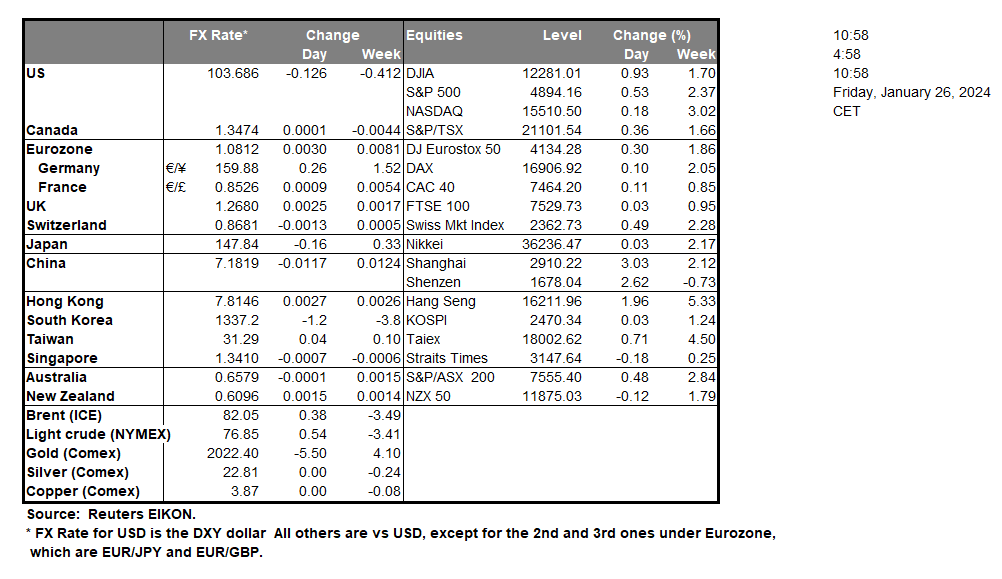 The USD edged lower against its counterparts yesterday even though the preliminary US GDP rate for Q4, slowed down less than what the market expected. The release tended to underscore the possibility of a soft landing for the US economy. The durable goods orders for December slowed down more than expected, signaling a possible hesitancy on behalf of US businesses to actually invest in the US economy, while the weekly initial jobless claims figure rose more than expected, implying the possibility of a slack being built in the US economy. Today’s market attention falls on the US Core PCE price index for December, the Fed’s favorite inflation measure and a possible failure to slow down may provide some support for the USD. US stock markets ended the day rather mixed on Thursday, with the earnings season in full force. Today we note the release of the earnings reports of Caterpillar (#CAT), American Express (#AXP) and Colgate-Palmolive (#CL) which could shake the markets.