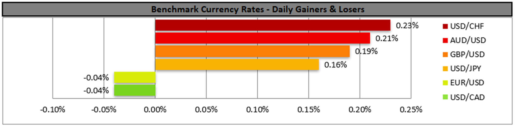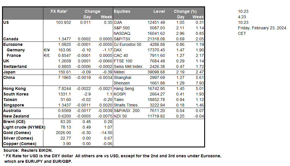 The USD managed to stabilize somewhat yesterday against its counterparts, yet the bearish sentiment does not seem to have left the market quite yet for the greenback. On the other hand, US stock markets rallied yesterday with all three main stock market indexes, namely the Dow Jones, Nasdaq and S&P 500, uniformly rising and reaching new record high levels. The rally was at least partially underpinned by NVIDIA’s meteoric rise yesterday after the better-than-expected readings in its Q4 earnings report. The company’s share price soared by 16% adding reportedly further capitalization of $277 billion. Should the positive market sentiment be maintained we may see US stock markets being supported.