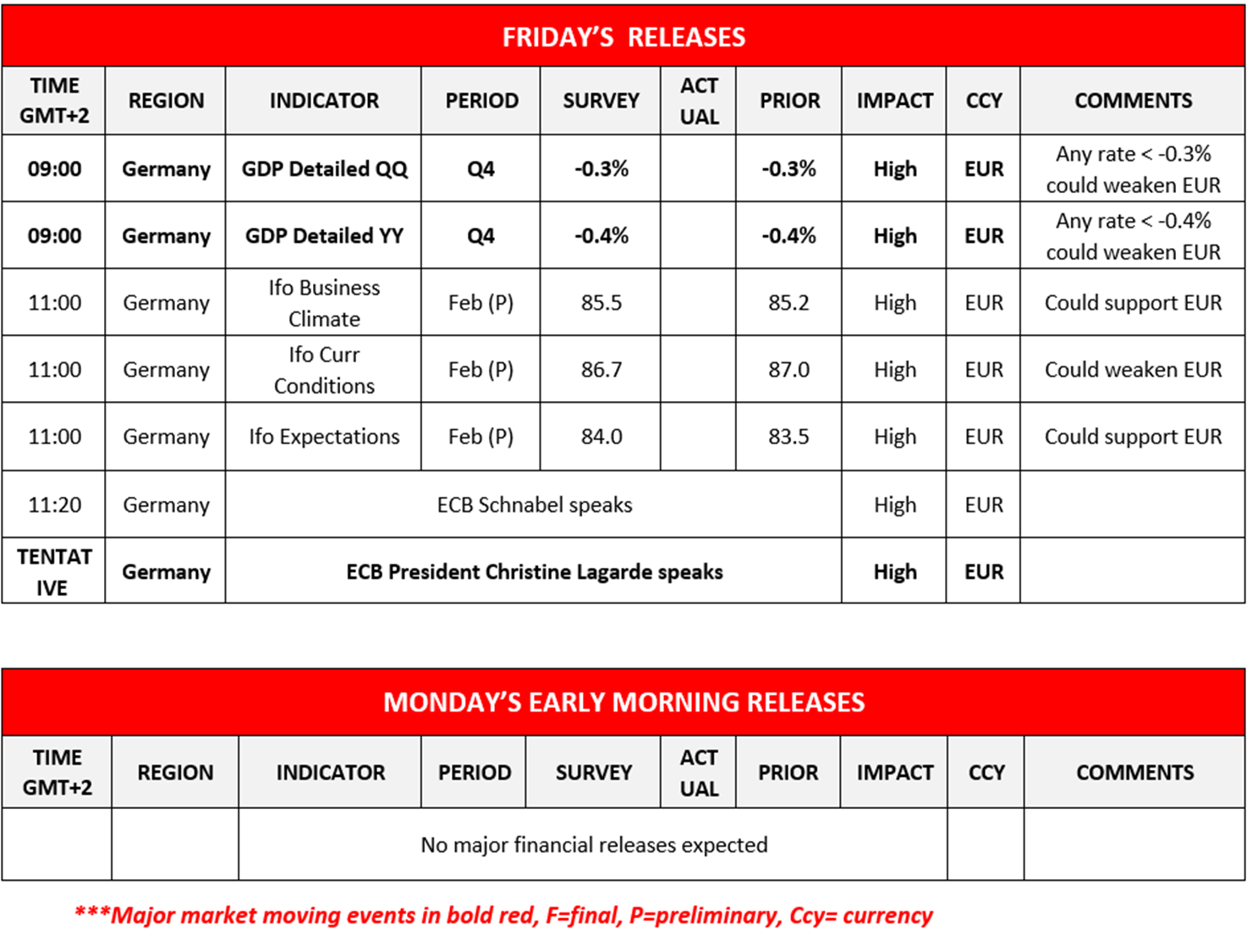 We note in today’s European session, Germany’s GDP rates for Q4, followed by Germany’s preliminary Ifo business climate, Ifo current conditions and Ifo expectations figures all for the month of February. In tomorrow’s Asian session, we note no major financial releases are expected. On a monetary level, we note the speeches of ECB Schnabel and ECB President Lagarde.