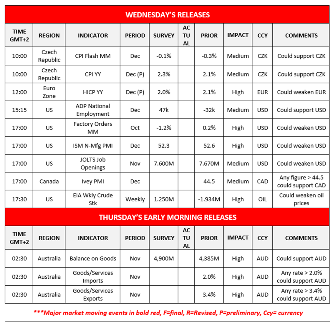 Today we get the Czech Republic’s preliminary CPI rates for December, the Eurozone’s preliminary HICP rate for December, Canada’s Ivey PMI figure for December and the EIA weekly crude oil inventories figure. In tomorrow’s Asian session, we get Australia’s trade balance data for November.
